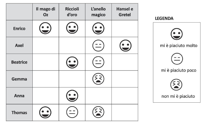 D10. Sei bambini leggono alcuni libri. La tabella mostra il parere di ogni bambino sui libri che ha letto.