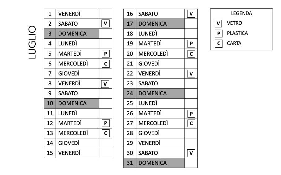 D1a. Il calendario mostra quando c'è la raccolta del vetro, della plastica e della carta in una città nel mese di luglio.